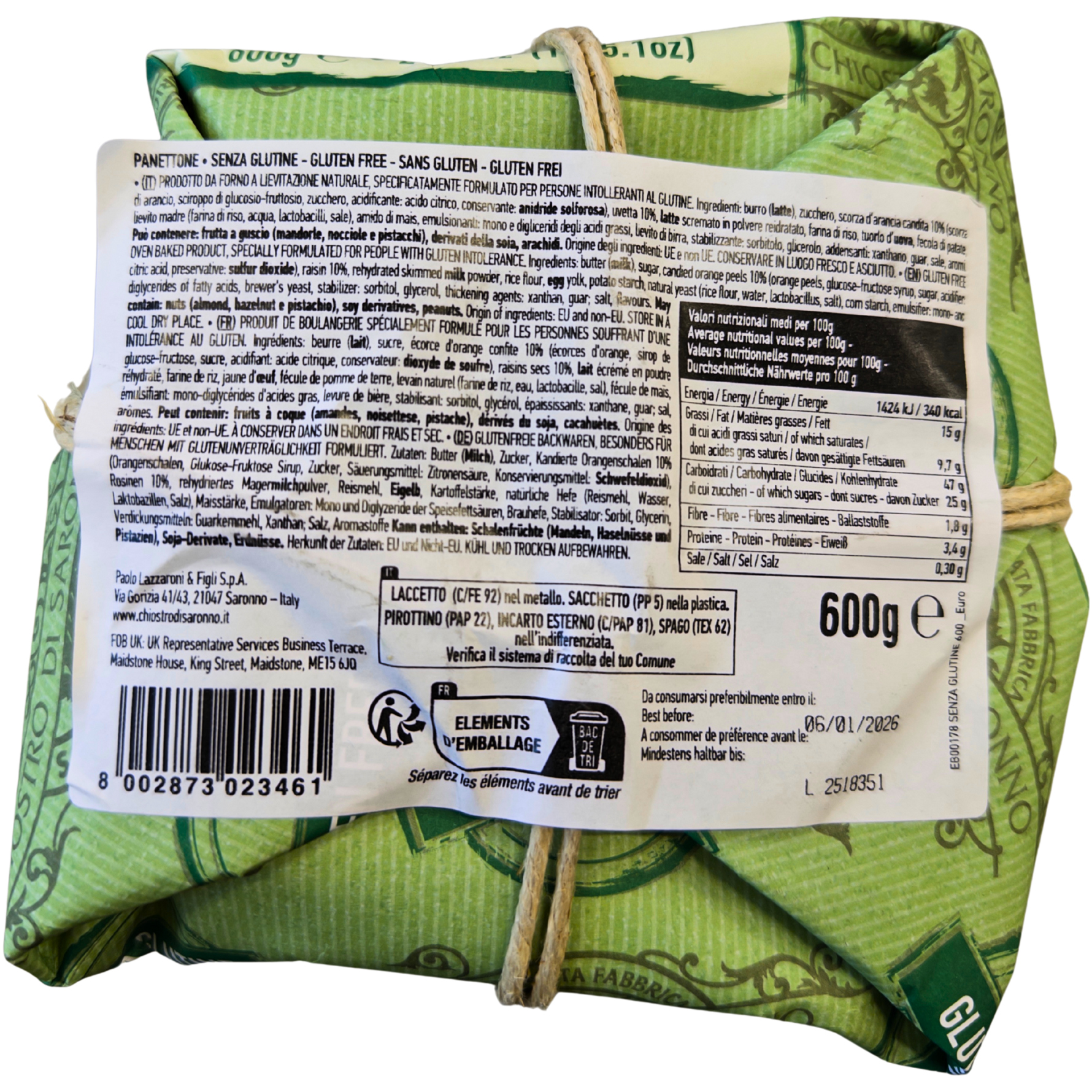 Opbevar Glutenfri panettone opbevares på et køligt og tørt sted, væk fra varmekilder. Efter åbning skal den pakkes godt ind og spises inden for få dage for at bevare friskheden og blødheden.