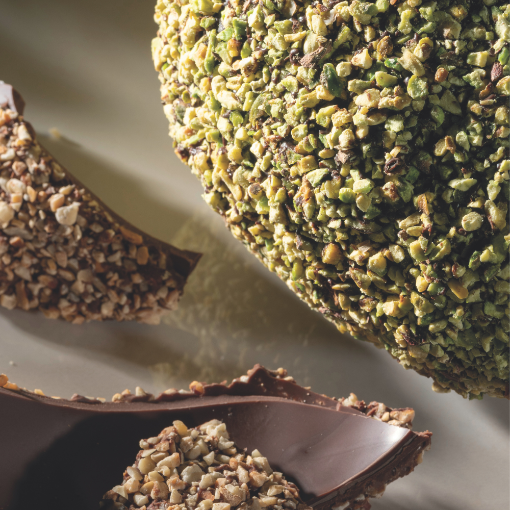 Aussehen: Ei in klassischer Form mit einer Oberfläche, die vollständig mit leuchtend grünen Pistazienstückchen auf einer Basis aus glänzender Zartbitterschokolade bedeckt ist.
