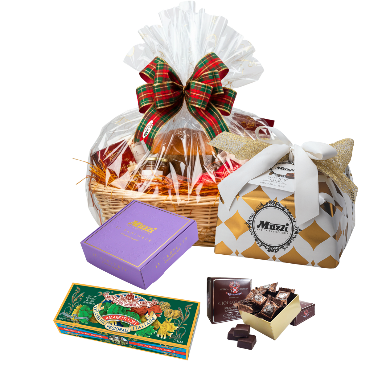 Der Cesto Specialità Roberta Korb enthält authentische italienische Exzellenz: einen weichen Panettone Tradizionale von Hand verpackt, die köstlichen Amaretti del Chiostro di Saronno, elegante Cioccolatini all'Aceto Balsamico di Modena g.g.A. und den Klassiker Panforte mit Mandeln und kandierten Früchten. Ein perfektes Geschenk, um die besten regionalen italienischen Spezialitäten zu entdecken.