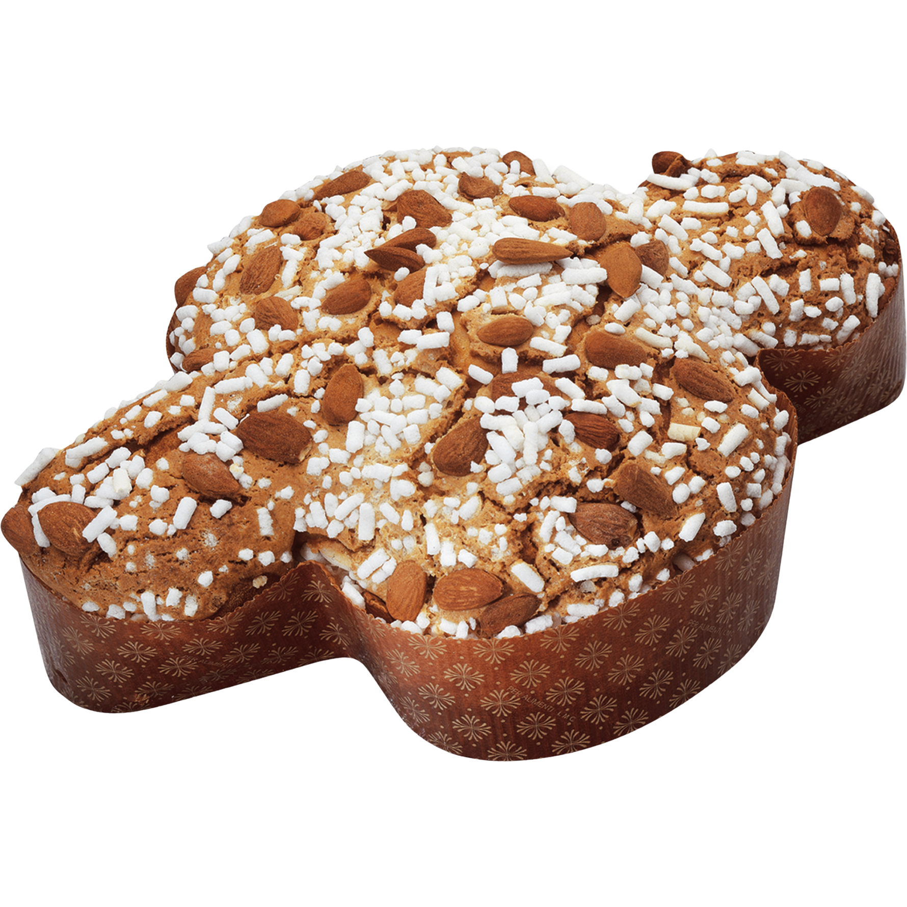 Appearance: Well-defined dove shape with a rounded surface; irregular, rustic glaze with whole almonds and sugar sprinkles in relief; soft and stringy internal honeycomb structure