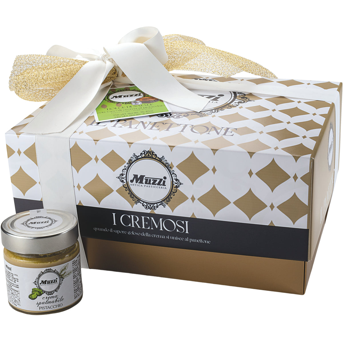 Soft Christmas cake without raisins and candied fruit, accompanied by a jar of pistachio cream and a sachet of powdered sugar to sprinkle on top. A delicious and refined combination in an elegant gift box, perfect to enjoy or give as a gift.