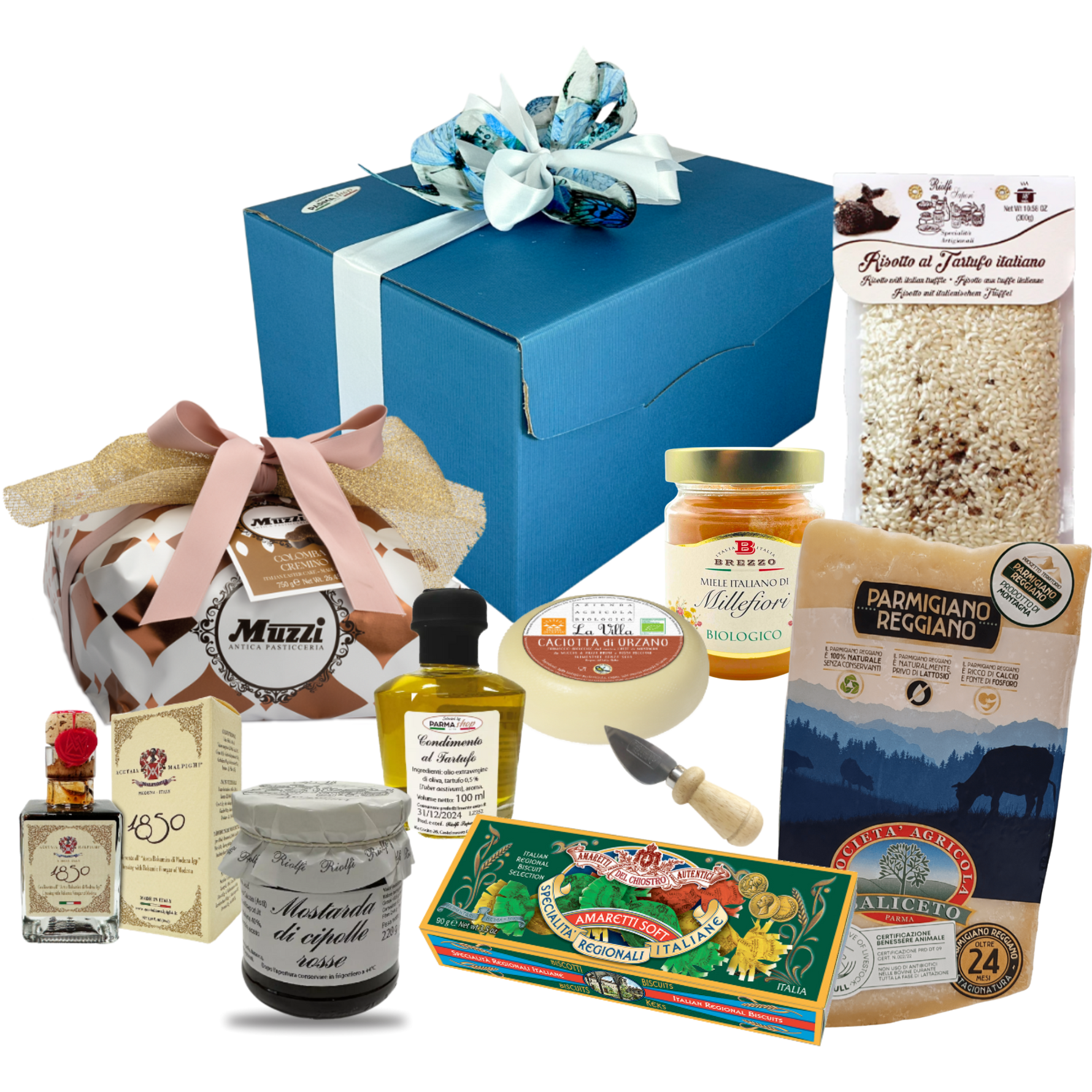 Célébrez Pâques avec l' t la Box Spécialités - Bleu, un voyage à travers les saveurs authentiques de l'Italie la plus raffinée. Chaque produit raconte une histoire de tradition: du parfum intense de l' u Parmigiano Reggiano DOP au goût envoûtant de l'huile à la truffe, en passant par la douceur de l' u Colomba Artigianale. Un cadeau spécial pour des moments inoubliables.