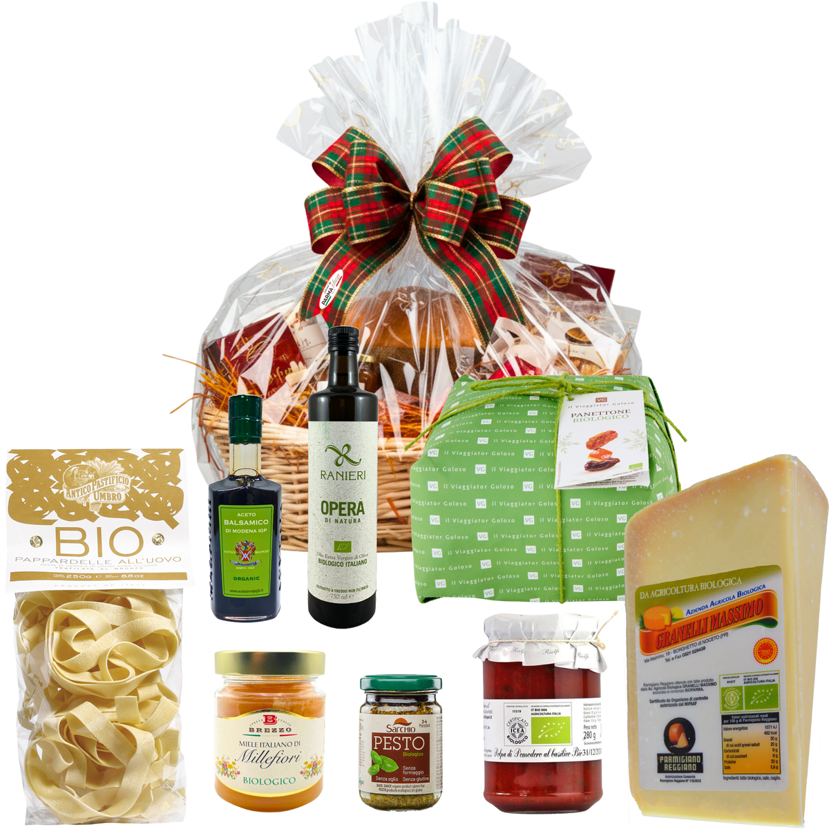 Upptäck den ekologiska Julspesial, en raffinerad urval av italienska ekologiska produkter av högsta kvalitet. Från ekologisk Parmigiano Reggiano SUB till Millefiori-honung och ekologisk extra jungfruolja, denna gåva hyllar den autentiska och hållbara smaken av Made in Italy.