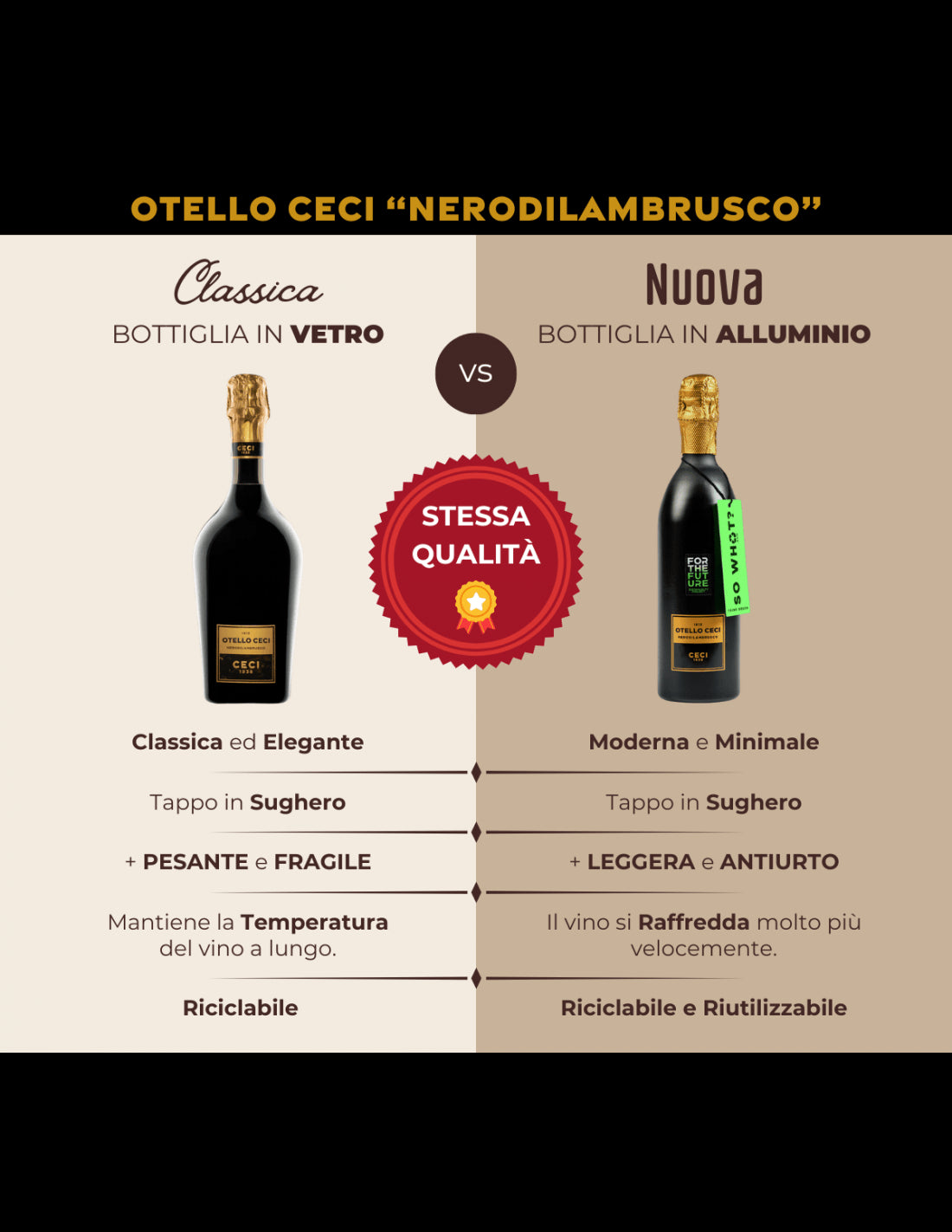 Otello Nerodilambrusco - Lambrusco Emilia IGT är symbolen för Cantine Ceci:s excellens , nu i en 100 % återvinningsbar aluminiumflaska, som ingår i det hållbara projektet "Forthefuture". Denna mousserande röda Lambrusco förenar tradition och innovation och erbjuder ett vin med karaktär, perfekt för den som vill ha en kvalitetsprodukt med ett ekologiskt fotavtryck. Ett konkret steg mot en mer ansvarsfull produktion, utan att ge avkall på den äkta smakupplevelsen.