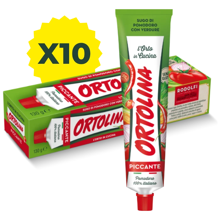 För dig som älskar starka smaker är detta det perfekta förrådet: Maxi-förpackningen med 10 tuber Ortolina Piccante. En färdig stark sås med tomat och en livlig touch av chilipeppar som ger karaktär åt varje rätt. Perfekt som pastasås eller för att ge dina recept extra krydda. Se till att du aldrig går miste om den äkta spänningen i det italienska köket.
