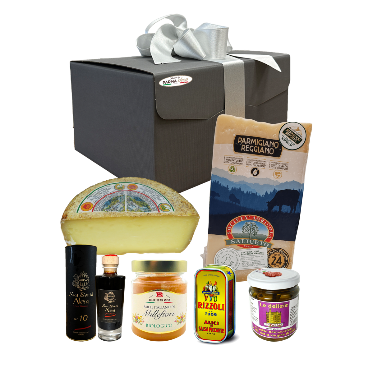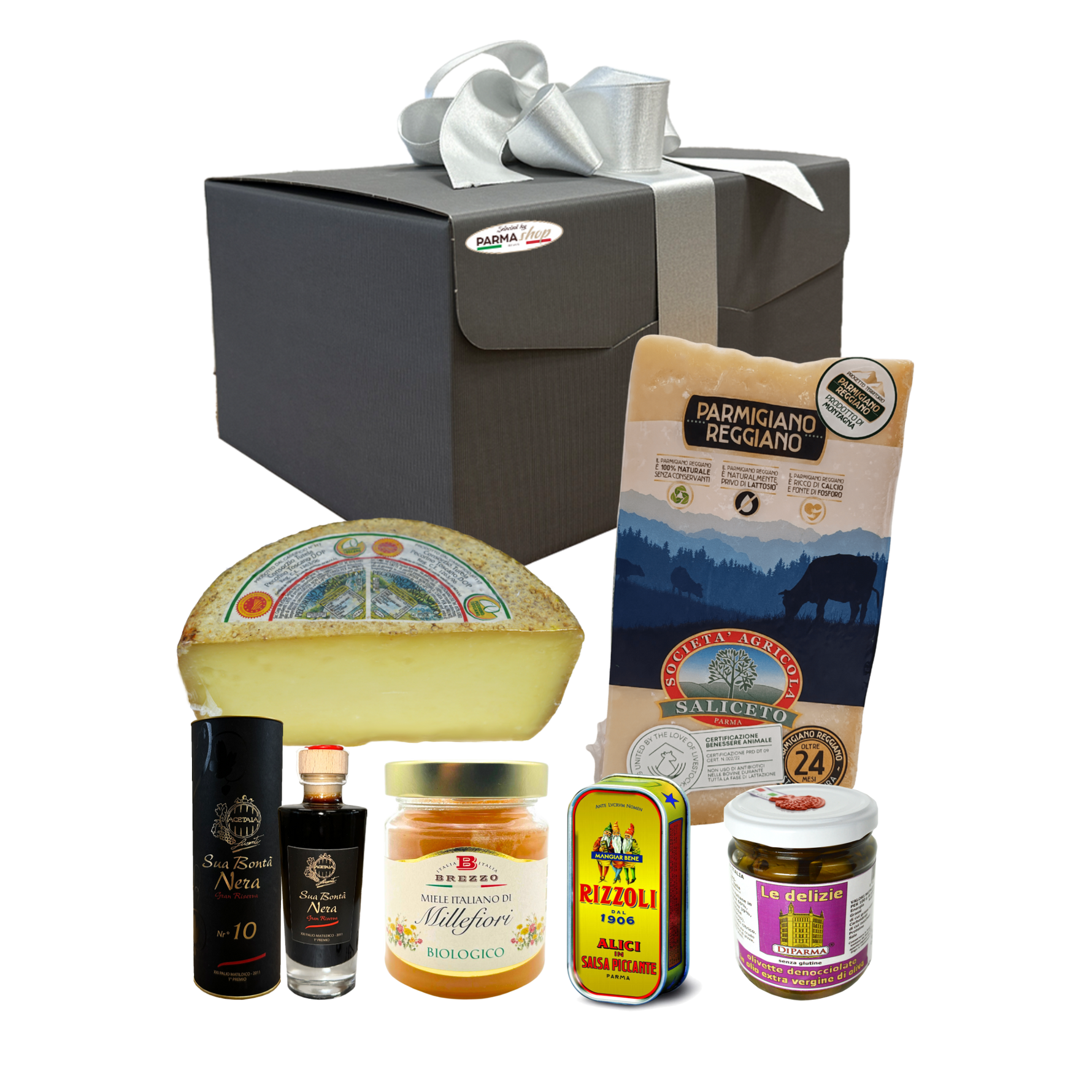 "Toscanini" - Specialitetsbox är en hyllning till italienska smaker som firar elegans och tradition, precis som den store mästaren Arturo Toscanini förde italiensk musik ut i världen. Varje produkt speglar harmonin mellan smakerna: karaktären hos Parmigiano Reggiano DOP di Montagna och Pecorino Toscano SUB, sötman hos Miele Millefiori och den raffinerade touchen hos Condimento Balsamico. En korg som inbjuder till en kulinarisk upplevelse inspirerad av italiensk passion och hantverksskicklighet.